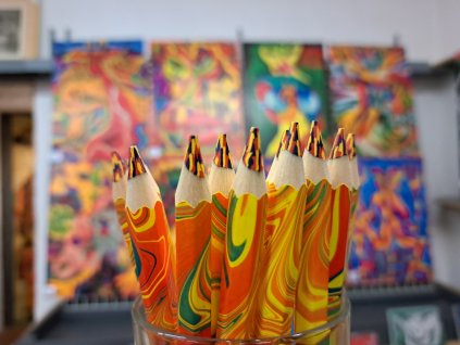 Sada 12 ks pastelových tužek v plechové krabičce s motivem díla rakouského malíře Janze Franze (1946 - 2017). Rozměr: 10 x 18 cm