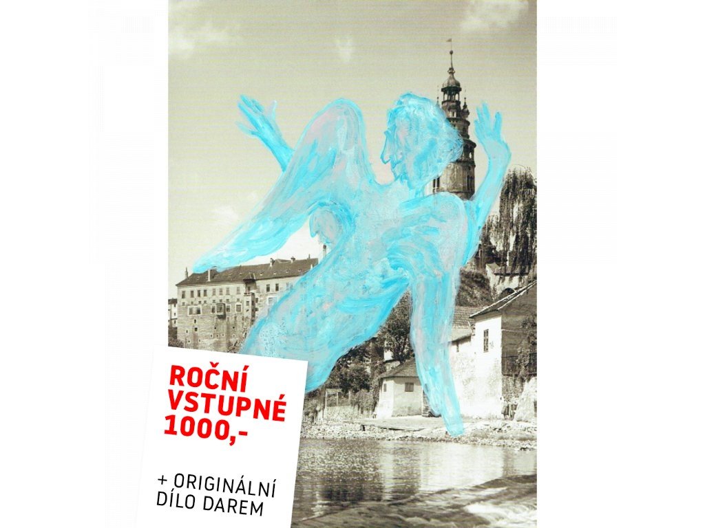 Cyklus Andělé nad Krumlovem MAGDALENY RAJNIŠOVÉ (formát A5, akryl na pohlednici se Schieleho krumlovským motivem)