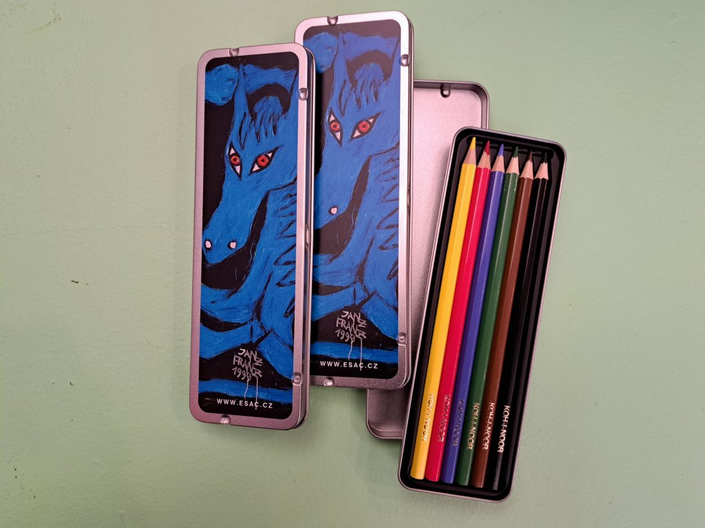 Sada 6 ks pastelových tužek v plechové krabičce s motivem díla rakouského malíře Janze Franze (1946 - 2017).